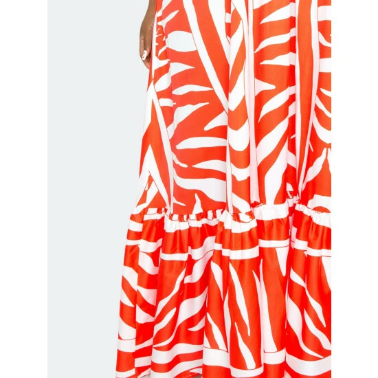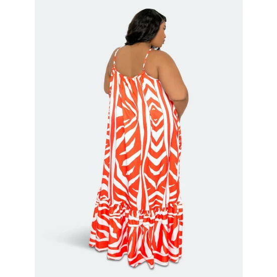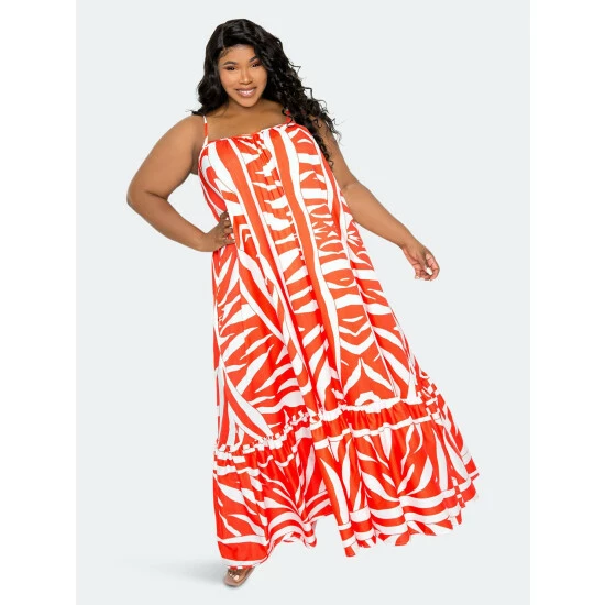 – Zebra print- Adjustable spaghetti strapped maxi dress- Voluminous tiered hem – This is one size (1X-3X) item- Our model is 5’8″