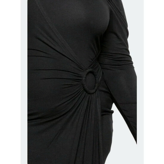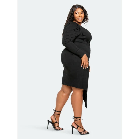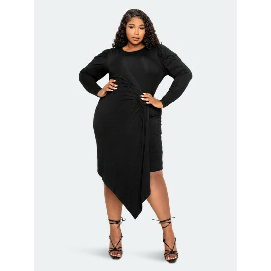 – Supersoft material- Shirred shoulder- Mock wrap detail with O-ring- Asymmetrical draped hem- True to size- 1X: 14-16, 2X:18-20, 3X:22-24- The model is 5’8″· Wearing 2X