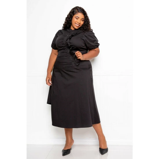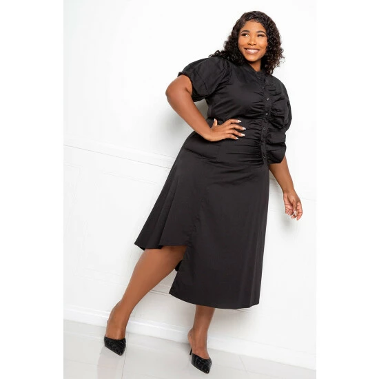 – Mandarin collar- Puff sleeves- Asymmetrical button with ruffles- Cut-out hem detail- True to size- Our model is 5’8″ · Wearing 2X