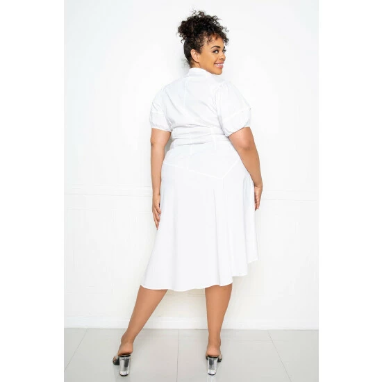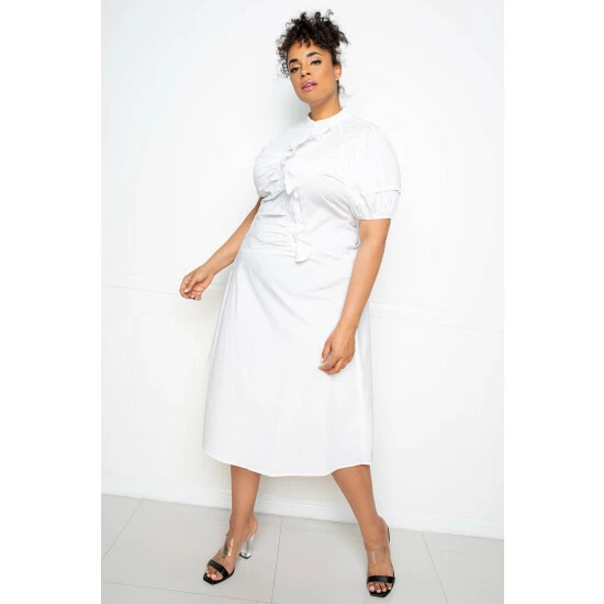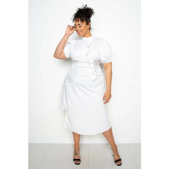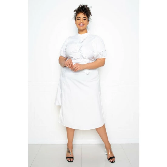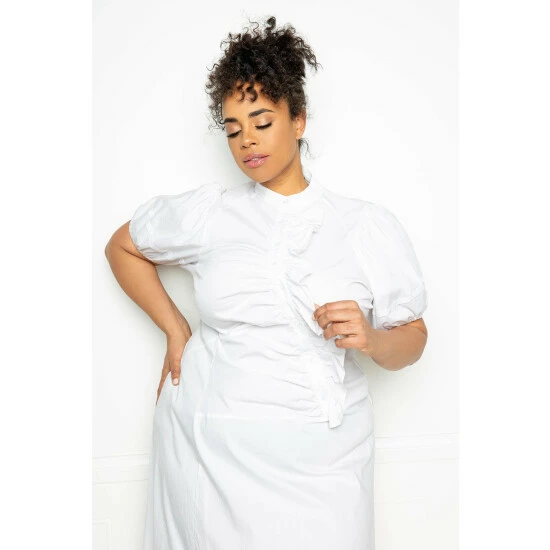 – Mandarin collar- Puff sleeves- Asymmetrical button with ruffles- Cut-out hem detail- True to size- Our model is 5’11” · Wearing 2X