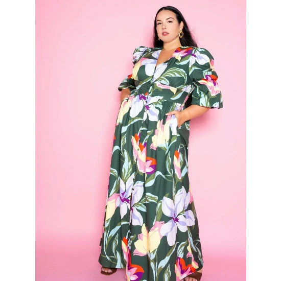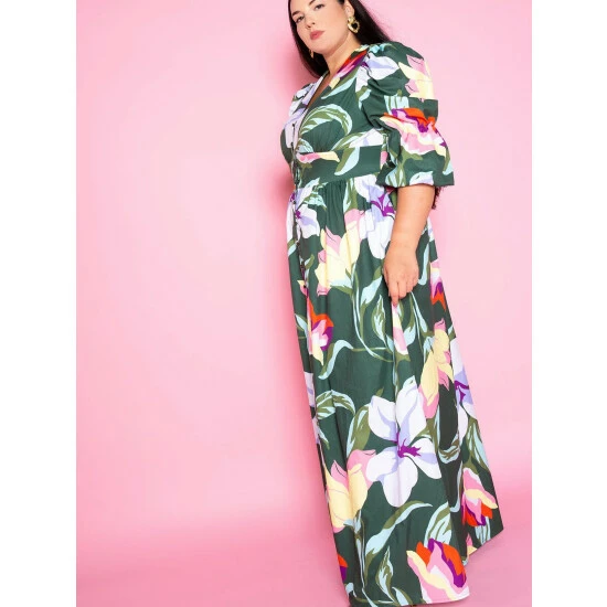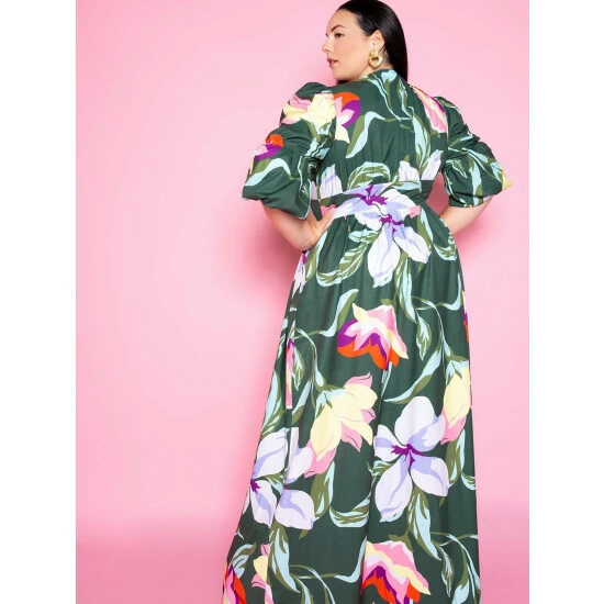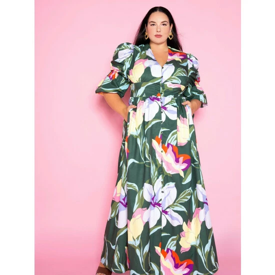Buxom Couture Floral Button-up Dress With Sleeve Accent Dresses & Jumpsuits Olive