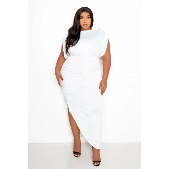 – Bateau neckline- Golden button epaulette on shoulders- Open back with chain detail- Chain detail on side slit- Ruched Asymmetrical hem- True to size- Our model is 5’8″ · Wearing 2X