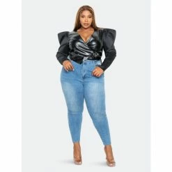 – Black PU leather- Structured shoulder- V neck- Wrapped with D-ring closure- Contrasted sleeve texture- Cropped fit- Imported- True to size- 1X=14-16, 2X=18-20, 3X=22-24- Our model is 5’8″ and wearing 2X