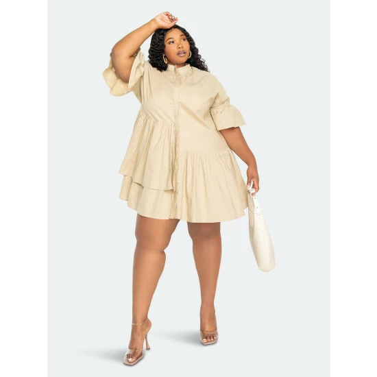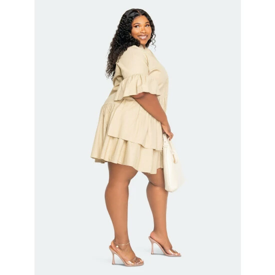 – Beige- Invisible front button closure- Mandarin collar- Flutter hem on sleeves- Double flutter layer detail- Relaxed A-line fit- No stretch linen- 70% cotton, 30% linen- Machine wash cold on gentle cycle. – Do not bleach- Imported- True to size- Our model is 5’8″- Wearing 2X