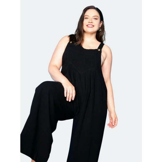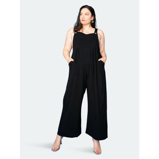 – Straight neck – Chest pocket- Straps with button closure- Relaxed fit- Side pockets- Patch pockets on back- 70% viscose, 30% hemp- Machine wash cold on gentle cycle.- Do not bleach- True to size- Our model is 5’10”. Wearing 2X for the oversized fit