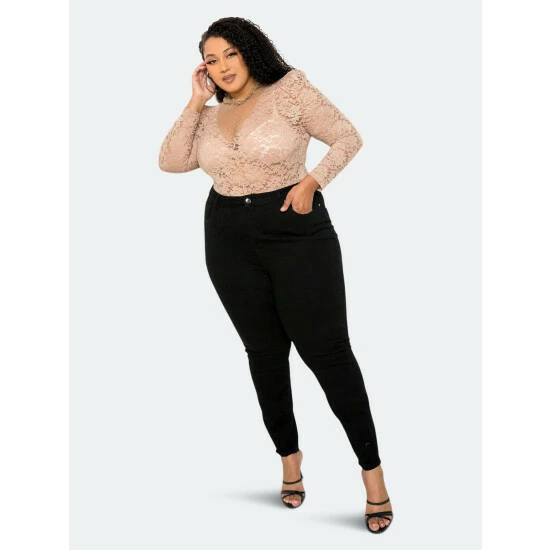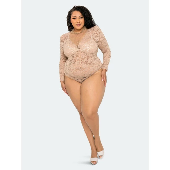 – Padded shoulder- Ruched mock neck on polka dot V-neck panel- Floral lace- Bikini fit with snap closure