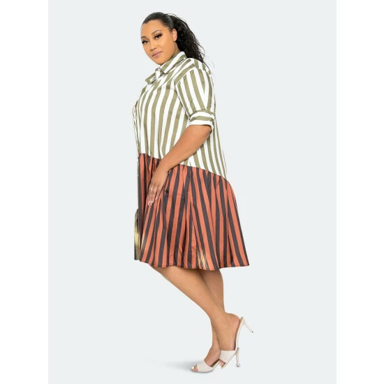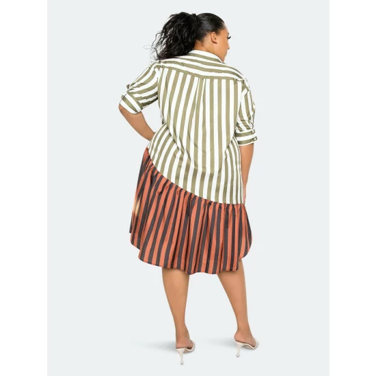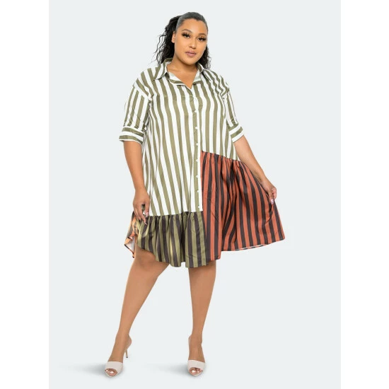 – Olive- Flowy shirt mini dress- Cuffed short sleeves- Patchwork with vertical stripes