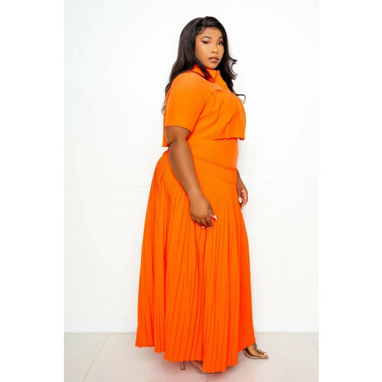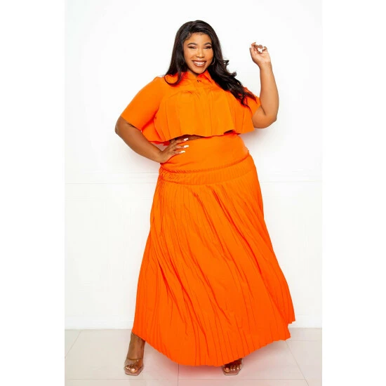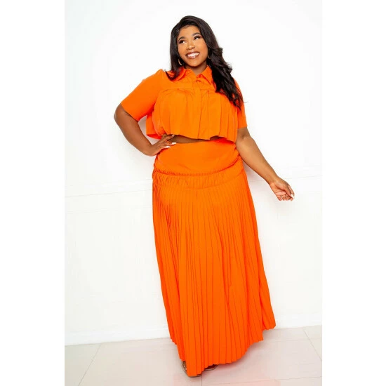 – Belt is not included but used for the purpose of styling.- Spread collar- Cropped button up shirt- High waisted maxi skirt- Hidden side zipper closure- Pleated detail- True to size- 1X=14-16, 2X=18-20, 3X=22-24- Our model is 5’8″ · Wearing 2X