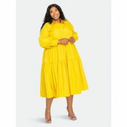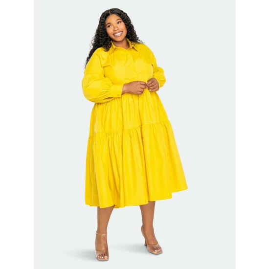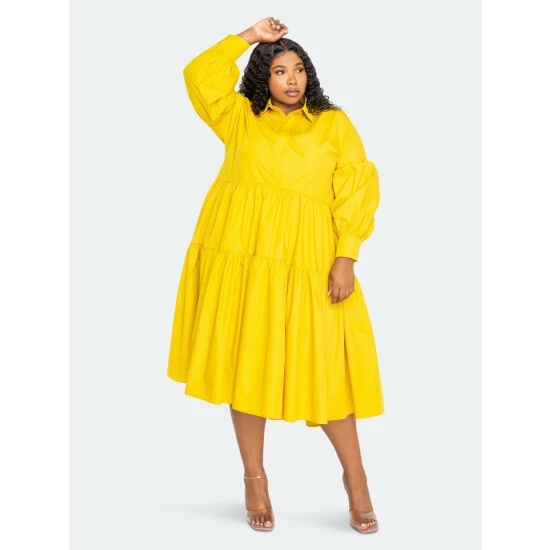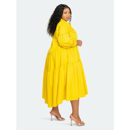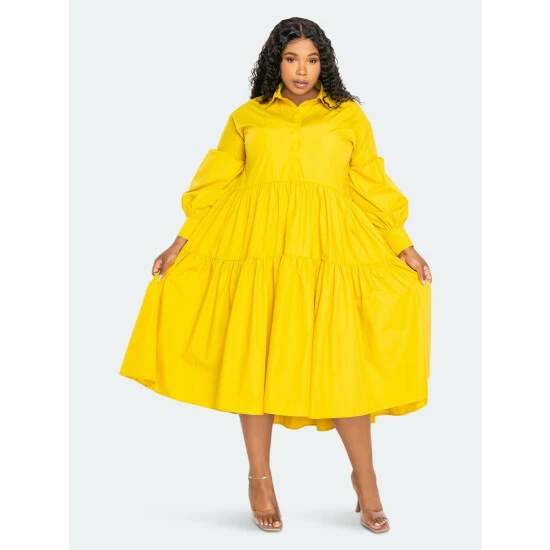 – Spread Collar- Dropped Shoulder- Button front closure- Puffed sleeves with button closure cuffs- Tiered skirt – True to size- 1X: 14-16, 2X: 18-20, 3X: 22-24- The model is 5’8″· Wearing 2X