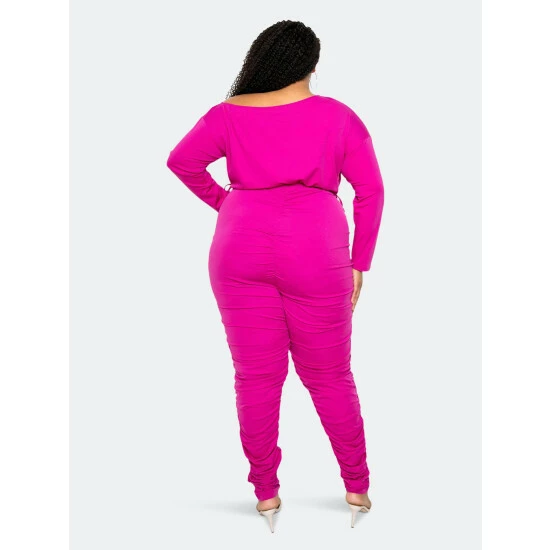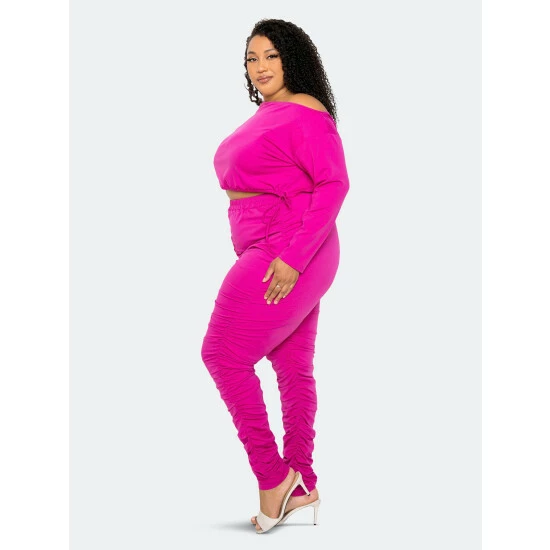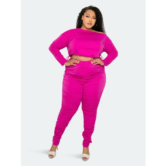 – Off-shoulder cropped top with ruched detail on the side- High wasted leggings with ruched detail on the side
