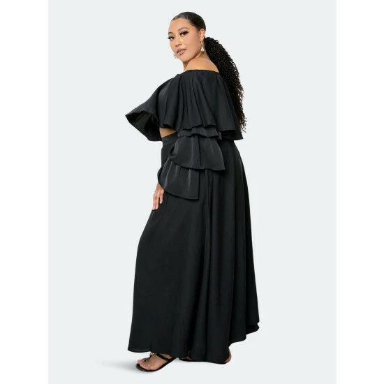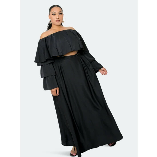 – Off-shoulder ruffle crop top with tiered sleeves- Maxi skirt with zipper