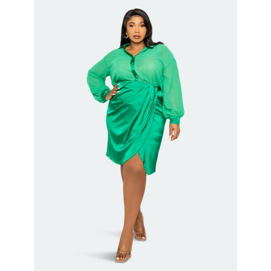– Spread collared- Front button closure- Oversized fit with dropped shoulders- Long sleeves with buttoned cuffs- Wrapped skirt with waist tie