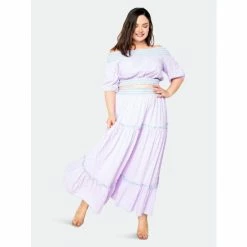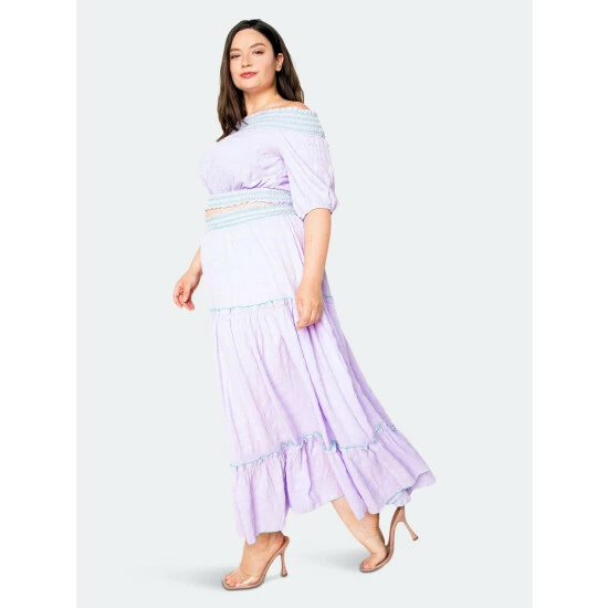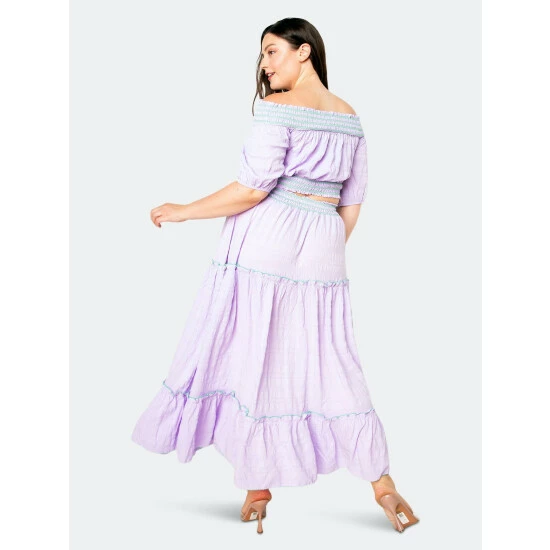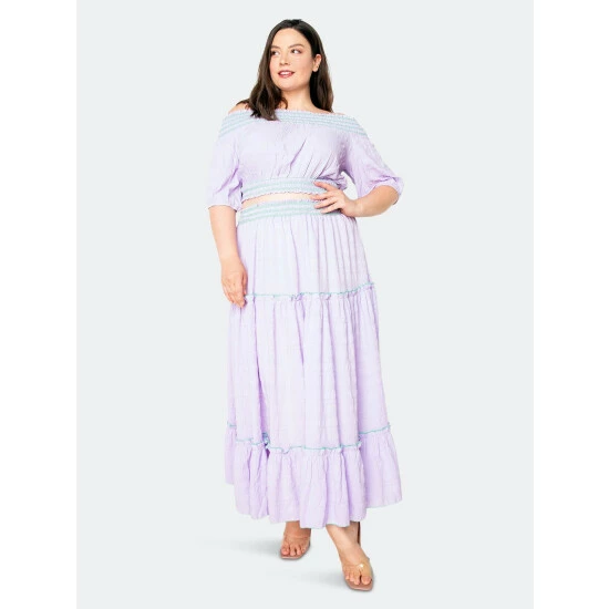 – High waisted maxi skirt- Off-shoulder cropped top- Smocking detail with contrasting stitch- True to size- Model is 5’10”, wearing 1X