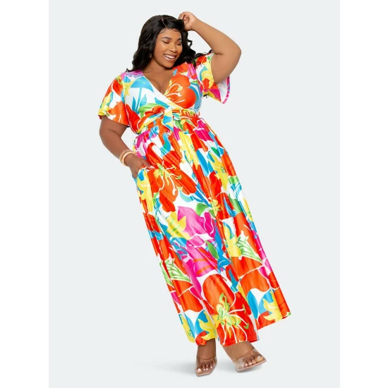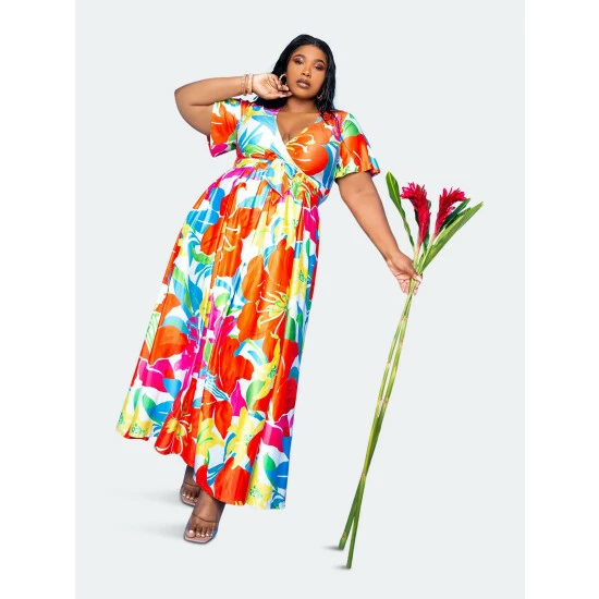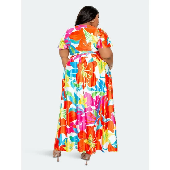 – Wrapped cropped top- Flutter sleeves- High waisted maxi skirt- 95% polyester, 5% spandex- Machine wash cold in a gentle cycle.- Do not bleach- True to size- Our model is 5’10”. Wearing 1X- Our model is 5’8″. Wearing 2X